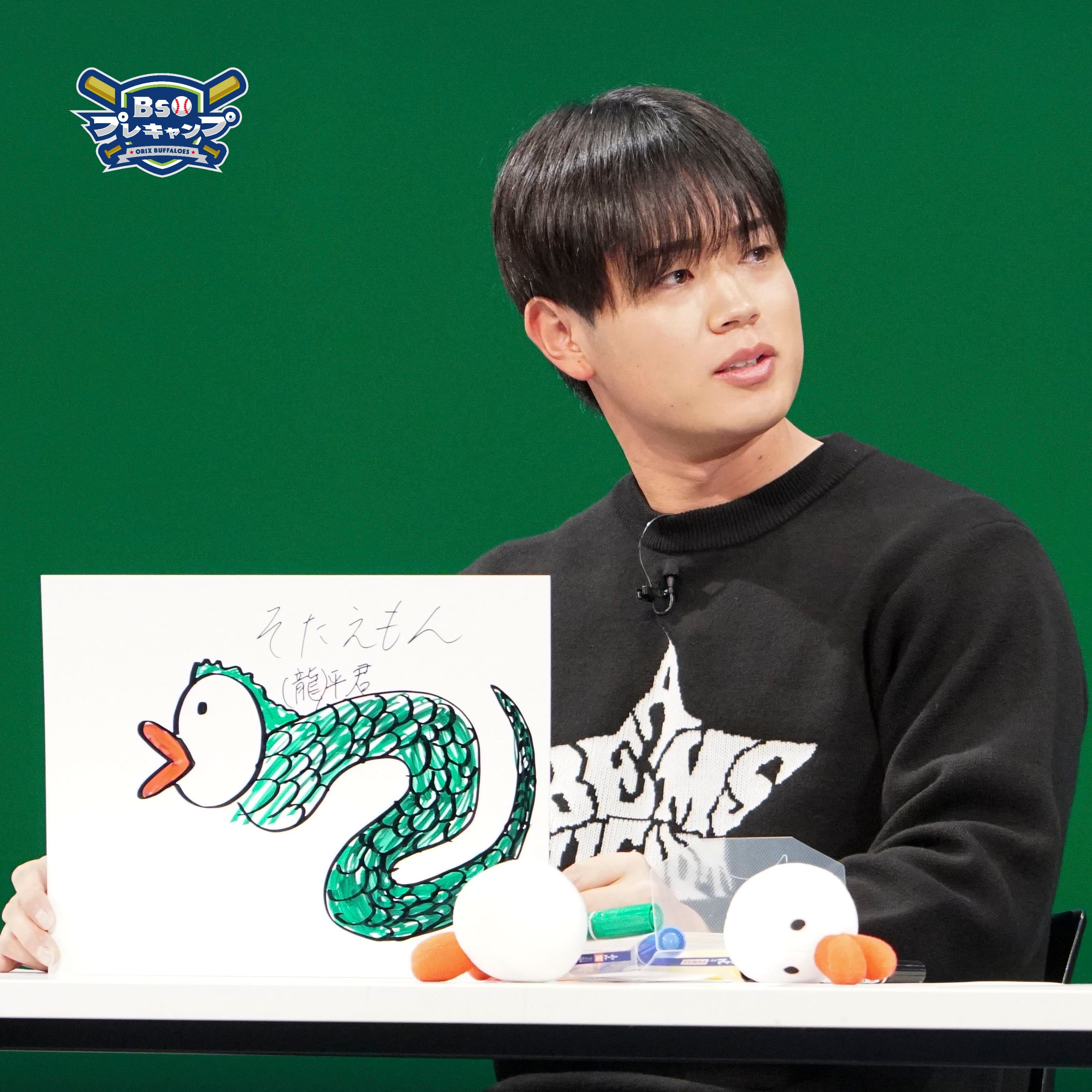 食べることが大好きな紅林選手のアイデアは、なんと『ハチエモン弁当』!ぬいぐるみを手に、正面から見たハチエモンを『白米・梅干し・ゴマ塩』で表現してくれました。